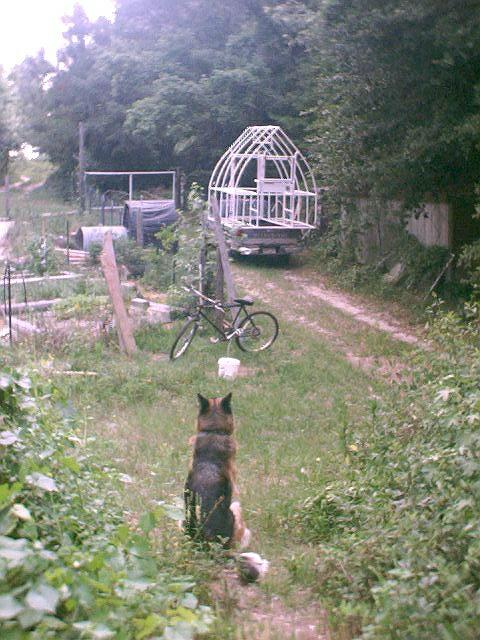 If you know much about sheps (and several other breeds), you know the hate having things change. It takes a while to adjust to new structures, strange vehicles, and worst of all, moving any part of their habitat. Several years ago I took a pair of greenhouses to a local festival and when it came time to return home, dismantled and hauled back the large one in sections but was able to bring the small one back intact. Since my helper had gone home ill (it got to 104 degrees that afternoon), I was whipped when I finally got this one home. The next morning at daybreak, Dina(saur) kept whining at me, trying to get me to follow. When I did, this is what I saw: